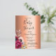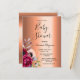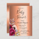 À frente: Um convite para Chás de fraldas moderno e elegante. Um fundo de folha metálica de cobre falsa. Decorado com flores roxas escuras e arrojadas e rosa cor-de-rosa. Modelos para a mãe ser o nome, data e local do chá. O texto: Chá de fraldas é escrito com um script de estilo extenso, escrito à mão, letras pretas. Sexo neutro, tanto para uma menina como para um bebê. Dica: Se você não quiser que pareça um cartão postal, clique em personalizar, vá para o verso e remova o divisor e o carimbo de posto.