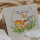 Jungle Safari Chá de fraldas Obrigado Nota que apresenta um macaco, elefante, girafa e leão para um chá de fraldas para raparigas, chá de fraldas para rapazes ou neutro em relação ao gênero.