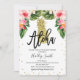 Convite para chá de fraldas de abacaxi tropical com aquarela de aquarela. Este design apresenta um abacaxi com brilho dourado falso, título de caligrafia preta e alguma folhagem tropical verde com flores cor-de-rosa. Esta é uma forma fresca, moderna e colorida de convidar convidados para um chá de fraldas que se avizinha.