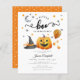 Um pequeno convite para chá de fraldas de abóbora de Halloween. Design moderno do Halloween para uma festa de dois! Este convite para o chá de fraldas apresenta uma abóbora, um chapéu de bruxa, um balão, cornos doces, uma lua e estrelas. Este convite é excelente para meninas e chás de garotos!