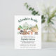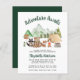 Chá de fraldas rústico e econômico por correio, com uma ilustração cúbica fofinha de animais da floresta acampar com sua tenda e fogueira nas montanhas e na floresta e "Aventura Aguarda" e o nome da futura mãe em um roteiro verde de caça escuro.