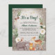 Chá de fraldas de inverno rústico e econômico, por correio, com aquarelas bonitinhas de madeira, flores, verde e uma camada de estrelas de ouro e flocos de neve. "É um Rapaz!" ou "É uma Rapariga!" e o nome da futura mãe está escrito num guião verde de caçador.