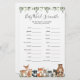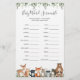 Os animais da floresta têm o tema "chá de fraldas word scramble card" (cartão de jogo de palavras-) apresenta uma ilustração com cor d'água, animais da floresta e verde-d'água, eucalipto garland, e uma elegante letra de estilo manuscrito.