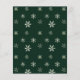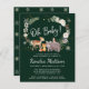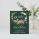Convite para chás de fraldas de inverno, de fácil execução orçamental, que inclui ilustrações agudas de cor da água de animais de floresta, flores, estrelas verdes e douradas e flocos de neve. "Querida!" e o nome da futura mãe está escrito em roteiros de creme claro contra um fundo verde de caçador negro.