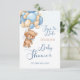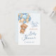 Este design apresenta um urso de pelúcia amigável com balão azul e creme. Os textos "Salvar a data" e "Chá de fraldas" são escritos no estilo de caligrafia.