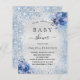 Um chá de fraldas moderno, elegante, celebrando um menino. Fundo metálico de aspecto fino prateado decorado com brilho azul, farelos e flores azuis, flores. Personalize e adicione um nome e detalhes da parte. Letras pretas coloridas.