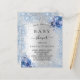 Um chá de fraldas moderno, elegante, celebrando um menino. Fundo metálico de aspecto fino prateado decorado com brilho azul, farelos e flores azuis, flores. Personalize e adicione um nome e detalhes da parte. Letras pretas coloridas.