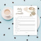 Chá de fraldas temido do café. Café de cor aquosa e xícara de café. Um coração feito de sabor a café. Respostas: CRAVINGS, CRYING, PACIFIER, FRASCO, LUZ NOTURNA, LULLABY, STROLLER, EPIDURAL, BURP, ALTA CADEIRA, SACO DE FRALDA, SWADDLE