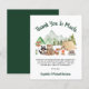 Cartões de agradecimentos rústico e econômico com chá de fraldas apresentando uma ilustração fofa de animais da floresta acampar com sua tenda e fogueira nas montanhas e na floresta e "Obrigado" e os nomes dos pais em um roteiro verde de caçadores escuros.