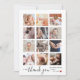 Um belo cartão de colagem quadrado estilo "Insta", perfeito para agradecer aos convidados do seu chá de fraldas por presentes, amor e suporte recebidos. O design moderno apresenta uma colagem de 12 fotos personalizáveis quadradas. Abaixo, há uma mensagem de "obrigado você" em uma escrita química e seu nome e data de nascimento, em letras simples. Na parte de trás está a mensagem personalizável do seu obrigado. Através do botão "personalização", você pode substituir as fotos e alterar o texto.