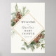 Bem-vindos convidados ao seu chá de fraldas de inverno com este belo poster, com um quadro de ouro rodeado por verde, pinecones e verde de inverno. Adicione o nome do convidado de honra, a data de chá e o texto de boas-vindas personalizado usando os campos fornecidos.