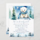 Inverno ártico do urso polar podemos esperar chá de fraldas orçamento Convite, ursinho polar agudo vestindo um cachecol azul sentado em pinheiros nevados de neve inchada convite para chá de fraldas de inverno para um garoto.