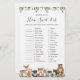 Animais da floresta temem gravidez de chá de fraldas quão doce é o cartão de caça apresenta uma ilustração de animais da floresta de cor d'água e verde-d'água eucalipto garland e uma elegante letra de estilo manuscrito.