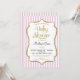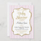 Um convite elegante, cor-de-rosa e chá de fraldas dourado, que inclui uma falso estrutura de sotaque dourada e listras cor-de-rosa e branca com texto dourado e preto. Este convite para chás de fraldas moderno é uma forma super na moda de convidar convidados para a sua celebração.