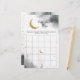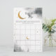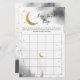 Sobre o tema da lua - cartão de atividade do chá de fraldas. Divirta-se no seu chá de fraldas com este cartão de jogo bingo. Salto de aquarela em cinzas com lua de ouro falsa e estrelas. O jogo de bingo aos hóspedes para adivinhar quais os presentes que as mamães irão receber. Ilustração original e design do Namibear Art Studio. ©BELGA_REDE