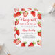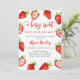 Cartão de convite para chá de fraldas de menina bonita com ilustração aquosa de morangos. O texto diz "um bebê doce de fruta está a caminho."