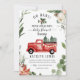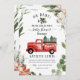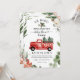 Grande verde, floreal e flocos de neve com um caminhão vermelho cheio de árvores de natal.