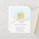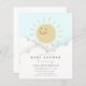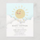 Tema do chá de fraldas neutro com ilustração de um sol com face sorridente sobre um céu azul com nuvens no fundo e texto de cinza.