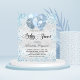 Um fundo metálico falso prateado. Decorado com poeira azul esfolada e balões. Personalize e adicione um nome, idade e detalhes da festa. O nome é escrito com um script de estilo manuscrito