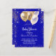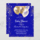 Um fundo azul real. Decorado com brilho sujo de ouro, faíscas e balões. Personalize e adicione um nome e detalhes da parte. O nome é escrito com um script de estilo manuscrito.