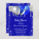 Um fundo azul real. Decorado com falso brilho prateado pingando o aspecto de pingar tinta, faíscas e balões. Personalize e adicione um nome e detalhes da parte. O nome é escrito com um script de estilo manuscrito.