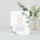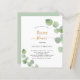 Bem-vindo a um Chá de fraldas elegante. Um fundo branco chic. Decorados com folhas de eucalipto de cor aquosa verde, prigos. Personalize e adicione o nome da mãe a ser e os detalhes da parte. Letras pretas e ouros.