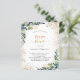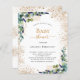 Bem-vindo a um Chá de fraldas elegante. Um fundo branco chic. Decorados com folhas de eucalipto, prigos, verde, folhas de ouro falso e pó de ouro, de cor aquosa verde. Personalize e adicione o nome da mãe a ser e os detalhes da parte. Letras pretas e ouros.