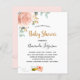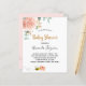 Para um Chá de fraldas, comemorando uma menina. Um fundo branco chic. Decorados com um rosa de ouro e rosa, flor, verde-eucalipto verde, cor-de-rosa pincelada, cor-de-rosa, folhas, um ouro, e um doce e feliz carregando de abelhas e um envelope. Personalize e adicione um nome e detalhes da parte. Letras pretas e ouros. O texto: Chá de fraldas e o nome da mãe a ser é escrito com um moderno estilo escrito à mão. Traseira: cor de fundo rosa dourada e abelha feliz sorrindo.