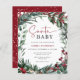 Um bebê Papai noel está vindo para a cidade! Um convite para chás de fraldas de Natal com aquarelas de inverno, cones de pinho e folhagem verde.