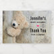Etiquetas para garrafas de chá de fraldas ou de outro evento, com uma fotografia de querido de um urso de pelúcia fofo, em pé de uma parede russa de madeira/pano de fundo.