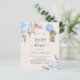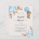 Para um chá de fraldas moderno estilo boho. Fundo branco. Decorado com flores azuis-claras, rosas, grama-pampas e um ursinho-peluche segurando um balão azul. Personalize e adicione um nome e detalhes da parte. 1 folha = 1 convite impresso de borda a borda.