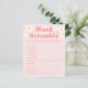 Desafie seus convidados com um jogo interativo do Word Scramble que traz alegria e riso ao chá de fraldas. À medida que desenterram palavras relacionadas com a gravidez, o bebê e a primavera, os hóspedes podem gozar de competição amigável enquanto celebram a chegada iminente do pequeno. Este jogo envolvente e divertido é perfeito para trazer risos e competição amigável para o seu encontro enquanto abraça o charme das margaridas florescentes e a frescura da primavera. Ordene agora que traga uma dose de diversão, riso e charme de primavera para o seu encontro, criando memórias duradouras para a mãe-ser e seus entes queridos. 🎉 🌷