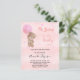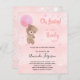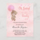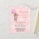 Para um chá de fraldas celebrando uma menina. Um fundo metálico de aparência falsa, cor-de-rosa, com poeira brilhante prateada falsa. Um ursinho de pelúcia segurando um balão rosa. Personalize e adicione o nome da mãe a ser e os detalhes da festa. Querida! e Barly são escritas com um estilo escrito à mão.