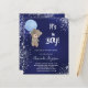 Para um chá de fraldas celebrando um menino. Um fundo azul marinho, a cor azul é irregular. Decorado com pó falso de cinza prateada. Um ursinho de pelúcia segurando um balão azul claro. Personalize e adicione o nome da mãe a ser e os detalhes da festa. O nome e o texto: É um Rapaz! são escritos com um estilo escrito à mão
