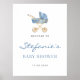 Bem-vindo a convidados para o seu evento com este sinal de boas-vindas personalizável ao chá de fraldas. Ele apresenta uma ilustração aquática de um adorável carrinho de bebê azul. Personalize este sinal de chá de fraldas adicionando seus detalhes. Este sinal de boas-vindas azul é perfeito para um chá de fraldas Boy.