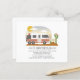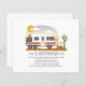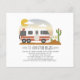 Aventura o temido chá de fraldas unisexo neutro com a ilustração da loteria amarela e vintage com roupas de bebê penduradas na linha de vestidos conectados ao cacto, um céu nascente do deserto com sol e nuvens. texto diz "a aventura começa"