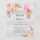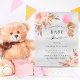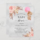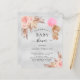 Para um chá de fraldas moderno estilo boho. Um fundo metálico falso prateado. Decorado com ouro rosa e flores cor-de-rosa, rosas, grama-pampas e ursinha-peluche segurando um balão rosa. Personalize e adicione um nome e detalhes da parte.