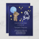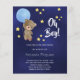 Para um chá de fraldas celebrando um menino. Um fundo azul marinho e estrelas amarelas. A cor azul é irregular. Um ursinho de pelúcia segurando um balão azul claro. Personalize e adicione o nome da mãe a ser e os detalhes da festa. O texto: Oh Boy! é escrito com um estilo escrito à mão