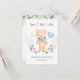 Este design apresenta um urso de pelúcia amigável com arco azul e balão cardíaco. Ele está cercado por folhagem verde. Textos Salvar a data é gravada no estilo de caligrafia. Na parte superior da placa - confete de efeito ouro.