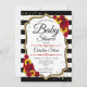 Convite para chás de fraldas. Design elegante com listras pretas e brancas e ouro brilhante falso. Possui girassóis, fonte de script de tendências do rosa vermelha e confetti. Perfeito para um Chá de fraldas na moda. Personalize com seus próprios detalhes.