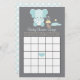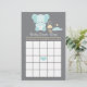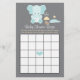 Um pequeno pássaro marrom segura um guarda-chuva de bolinhas amarela e se posiciona doce e pacientemente próximo a um bebê elefante azul claro vestindo um par de fraldas com um pino de fralda azul nele. Esta folha de bingo de chá de fraldas elefante é perfeita e uma maneira divertida de celebrar a nova mãe esperando um bebê. Trabalho de arte © Chrissy H. Studios, LLC. Todos os direitos reservados.