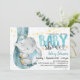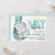 Um convite para chá de fraldas de elefante azul. Convite branco, azul e amarelo. Excelente para chás temáticos de animais selvagens ou safari.