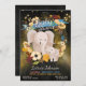 Belo e bonito design de convite com uma ilustração de elefante mãe e bebê, rodeada de flores e corações de amor. Esta mãe feliz e design de convite para bebês é colocada sobre um fundo preto de quadro negro com brilho dourado. Pode servir também ao cartão de anúncio do bebê ou ao primeiro cartão de aniversário do bebê. Cores neutras, mas vibrantes, são encontradas nesta design, fazer-a para um menino ou para uma menina. Feita com amor por Configura por Webgrrl.art