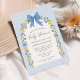 Este belo convite para chás de fraldas apresenta flores silvestres desenhadas à mão em tons de azul-bebê e amarelo, juntamente com um arco de cetim giro sobre uma estrutura em forma de arco. A parte traseira contém um padrão de arcos correspondente. Perfeito para a mamãe esperando um menino!