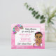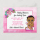 Bebê bonito com pele mais escura para representar bebês afro-americanos. Magenta com arcos e flores e o convite para cartão postal do chá de fraldas de barato de ursos de pelúcia.