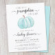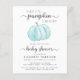 Um convite de chá para bebês bonitinho, alegre e econômico, com "A Sweet Little Pumpkin Is On Your Way" escrito em uma mistura de tipografia moderna de cinza mole e roteiro na moda, e uma aquarela azul pastel de uma abóbora. Você pode personalizar o nome da mãe e os detalhes do chá em uma simples tipografia de cinzas.