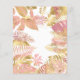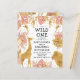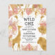 Este convite de chá de fraldas "selvagem" de safari da selva, tema da menina, apresenta folhas falsas de ouro (girafa, leão e macacos), folhagem dourada e rosa da selva, e uma aspersão de confete de ouro sobre fundo branco. Adicione o nome da futura mãe e os detalhes do chá em texto preto. No verso aparece um padrão de quadros coordenadores de folhas cor-de-rosa e douradas.