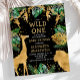 Este convite para chás de fraldas, chamado "selvagem", contém folhas falsas de ouro (girafa, leão e macacos), folhagem dourada e selva verde, e uma aspersão de confete de ouro sobre fundo preto. Adicione o nome da futura mãe e os detalhes do chá em texto branco e dourado. Um padrão de folhagem em verde e dourado em fundo preto decora a parte de trás da carta.