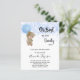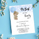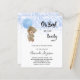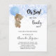 Para um chá de fraldas celebrando um menino. Um fundo branco. Um ursinho de pelúcia segurando um balão azul. Personalize e adicione o nome da mãe a ser e os detalhes da festa. O nome e o texto: Oh Boy! e Barly são escritos com um estilo escrito à mão.