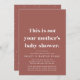 Os tempos modernos exigem um convite ao chá de fraldas moderno. Se você está fazendo a festa online devido ao distanciamento social, este é um convite perfeito para você. O texto ousado e lúgubre diz "Este não é o chá de fraldas da sua mãe" com ênfase em não, e os detalhes da parte abaixo incluem espaço para informações sobre reuniões sociais online, registro, informações de envio e muito mais junto com os detalhes da parte. A parte traseira apresenta um padrão de ponto lúdico. A cor mauve moderna é padrão, mas pode ser alterada clicando em "personalizar mais". Excelente para chás de co-ed, chás de adoção e dois pais ou dois casais da mãe também - e qualquer um que aprecie seu senso de humor e sagacidade!